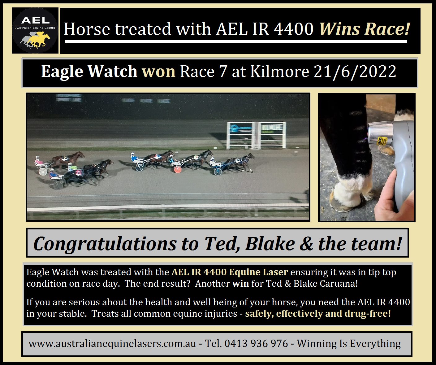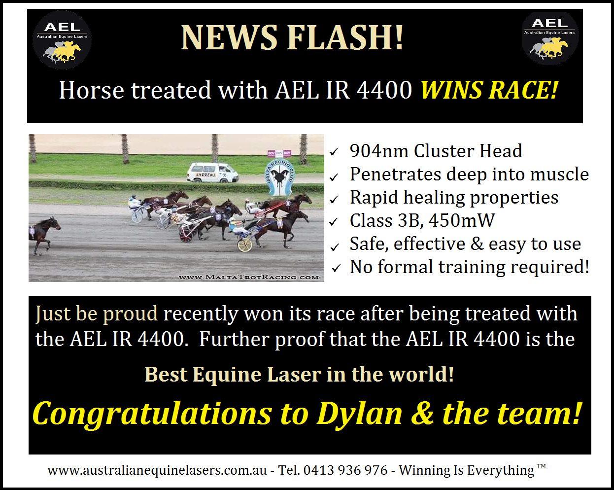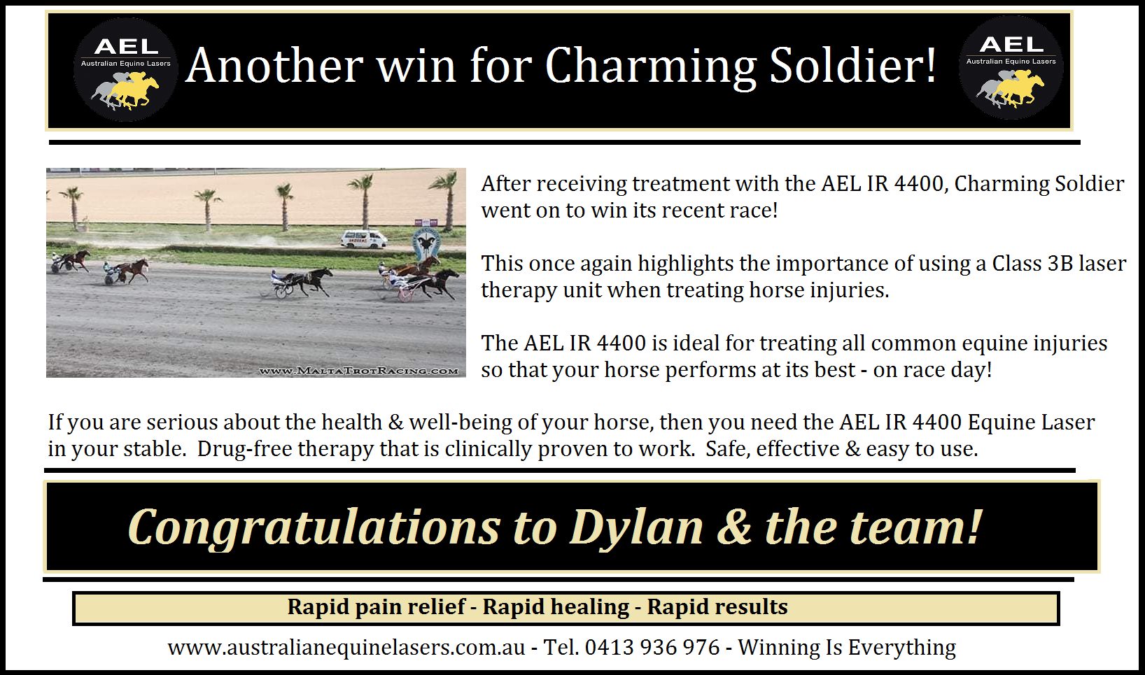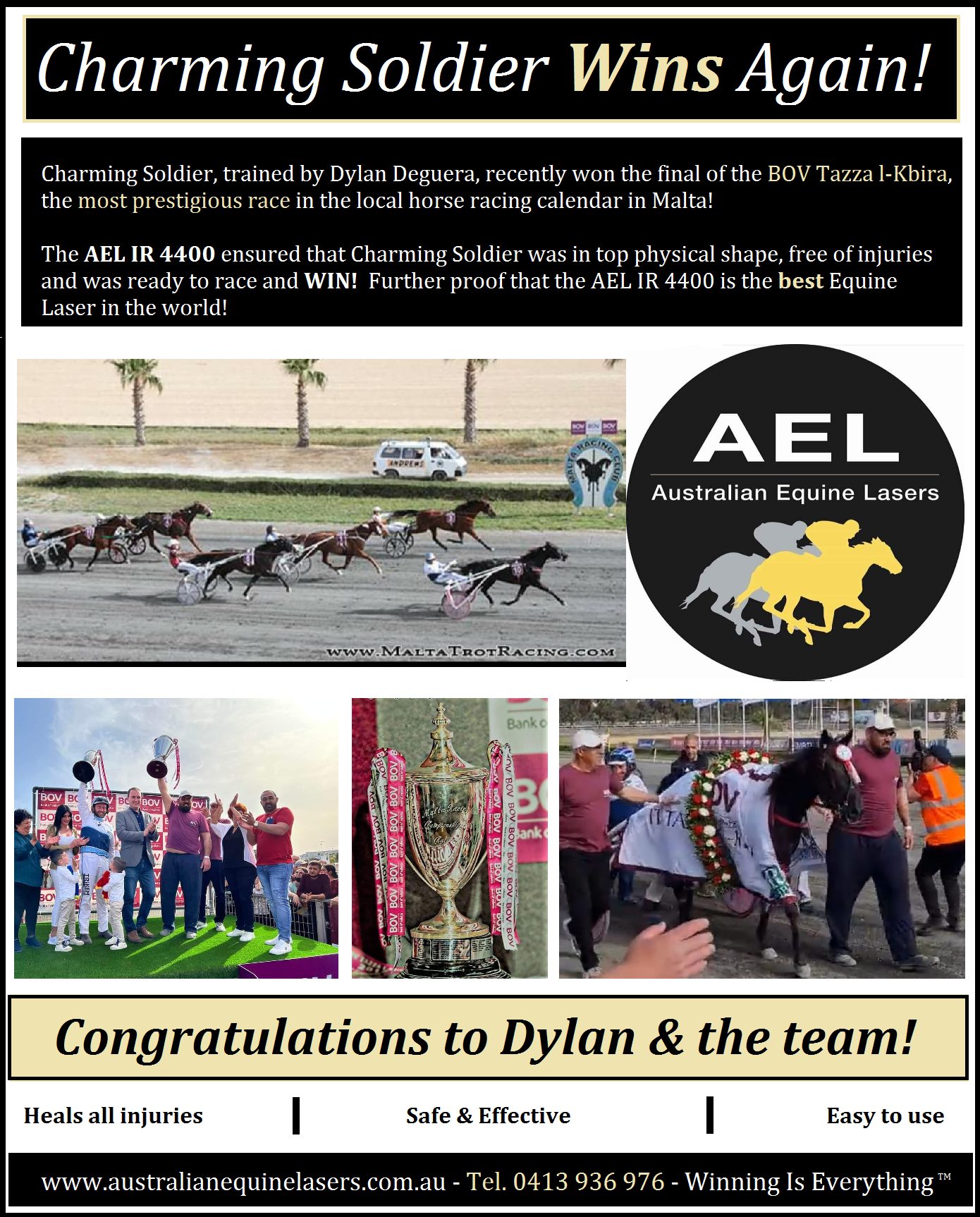 On November 14th, 2021 Just be Proud, trained By Dylan Deguara, one its race after being treated with the Australian made, AEL IR 4400 Equine Laser.