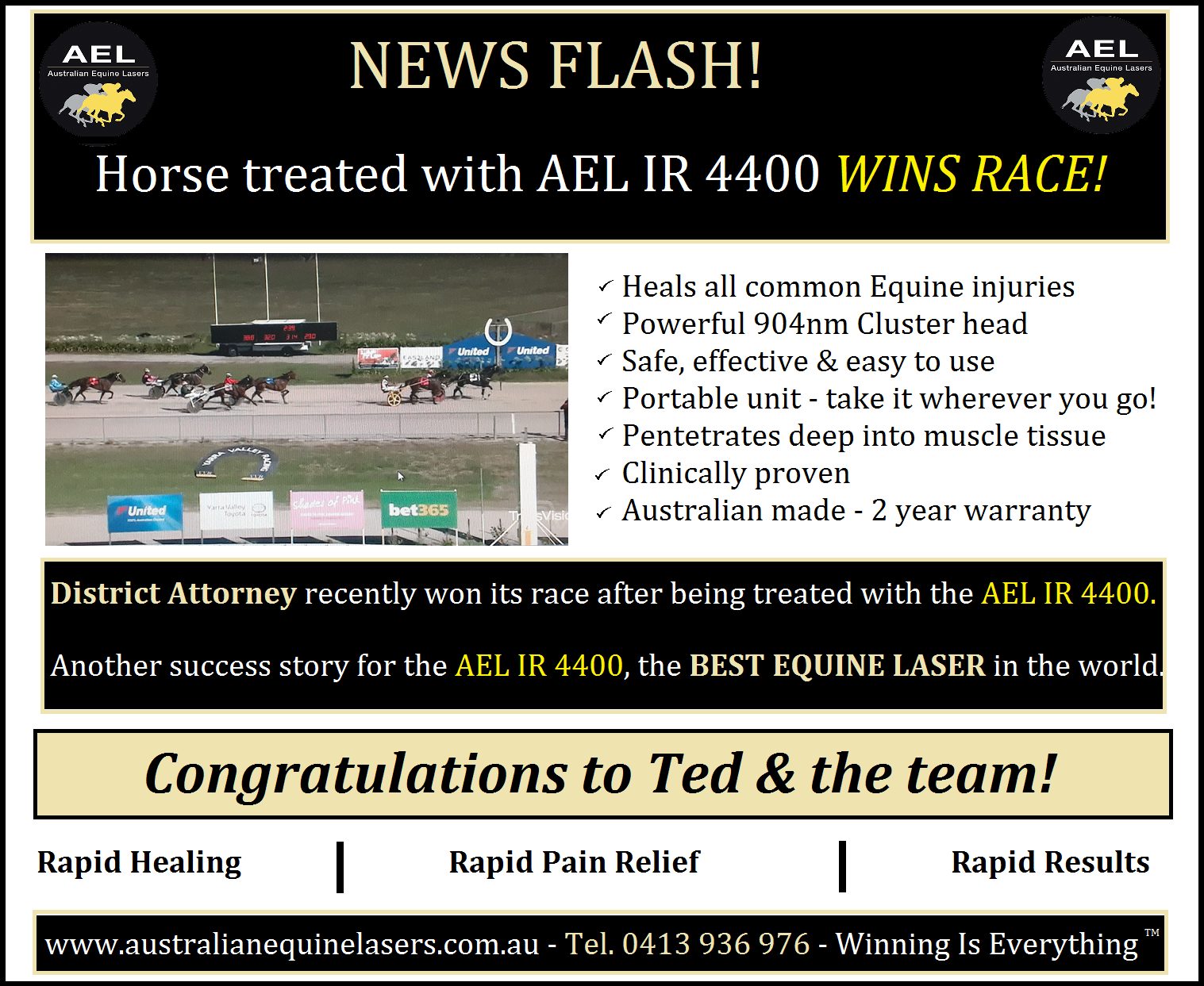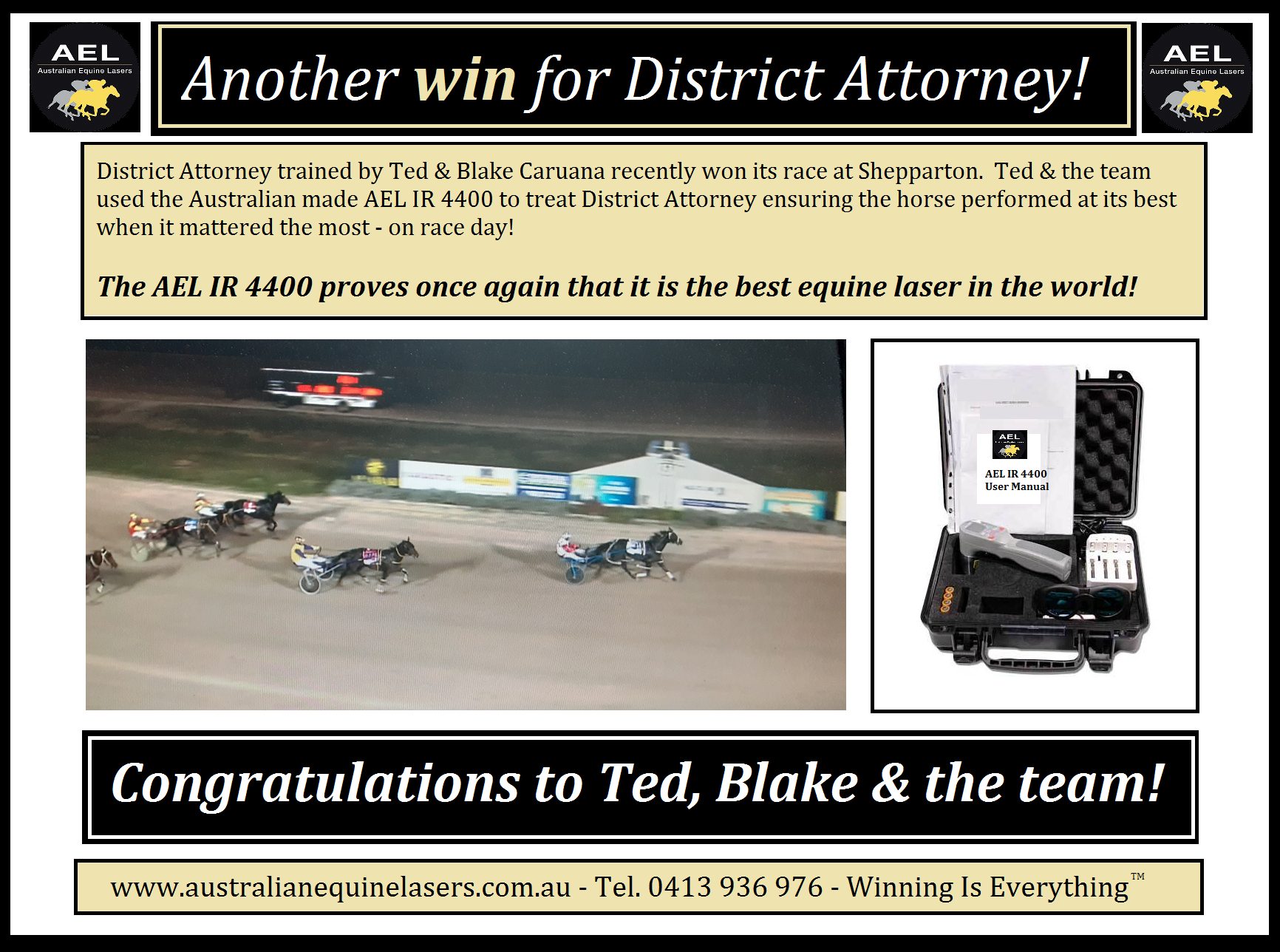 On February 7th, 2022, District Attorney trained by Ted Caruana won its race after receiving treatment with the AEL IR 4400. The AEL IR 4400 success stories and 5 star reviews continue…